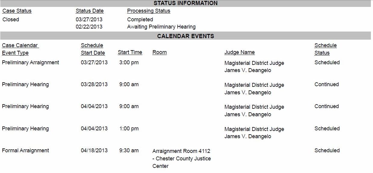 If you refer to the official court docket you will see that the date of the hearing in the court room of Magisterial District Judge James V. Deangelo has been moving about like a game of Chinese Checkers. The original hearing was 3/28/13 at 9 am. Then it was 4/4/2013 at 9 a.m. and then it was 4/4/2013 at 1 p.m. However on another docket most people never click on called the Public Court Summary is says “Next Action Date: 03/28/2013”